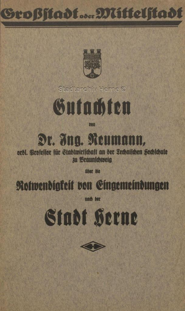 In einem weiteren Brief, geschrieben am 10. September 1919 legte er 60 Stücke einer „Denkschrift über die Vereinigung der Gemeinden Herne, Eickel und Wanne“ bei. In seinem Schreiben wies er darauf hin, „daß eine Vereinigung der Gemeinden schon deshalb erwünscht ist, weil einem großen leistungsfähigen Gemeinwesen die durch den Krieg erforderlichen großen Aufgaben erheblich leichter fallen würden, wie wirtschaftlich schwächeren Verbänden.“